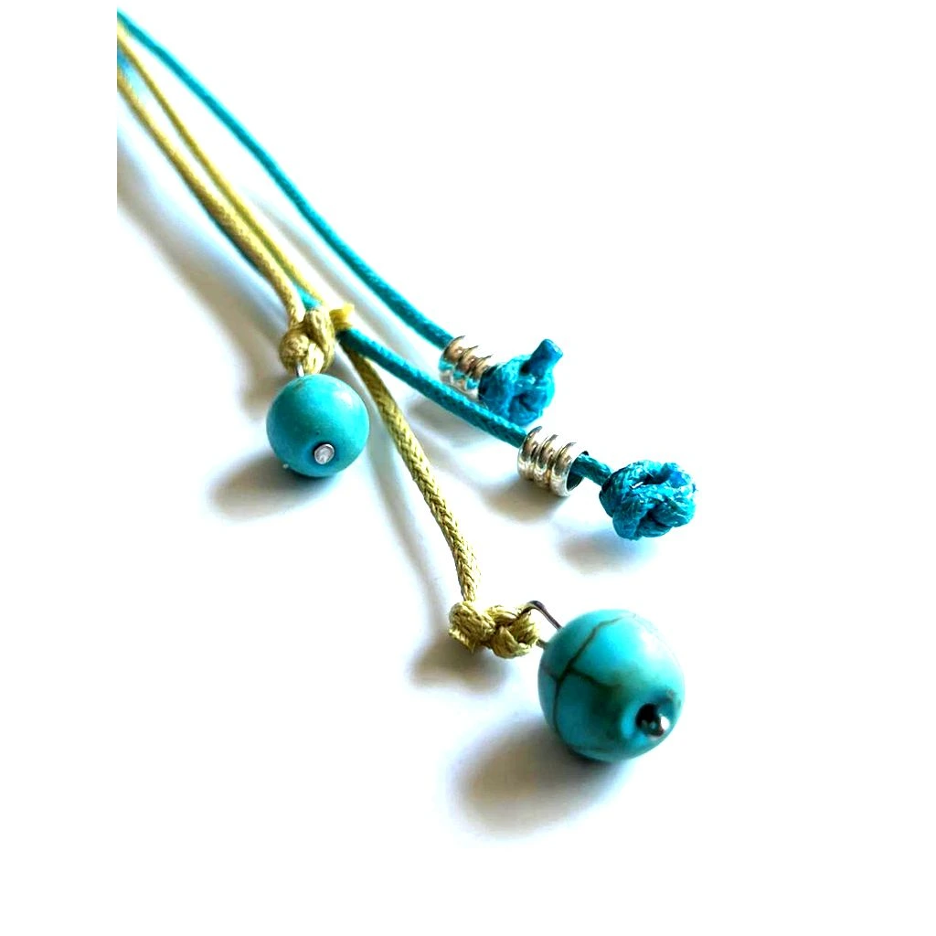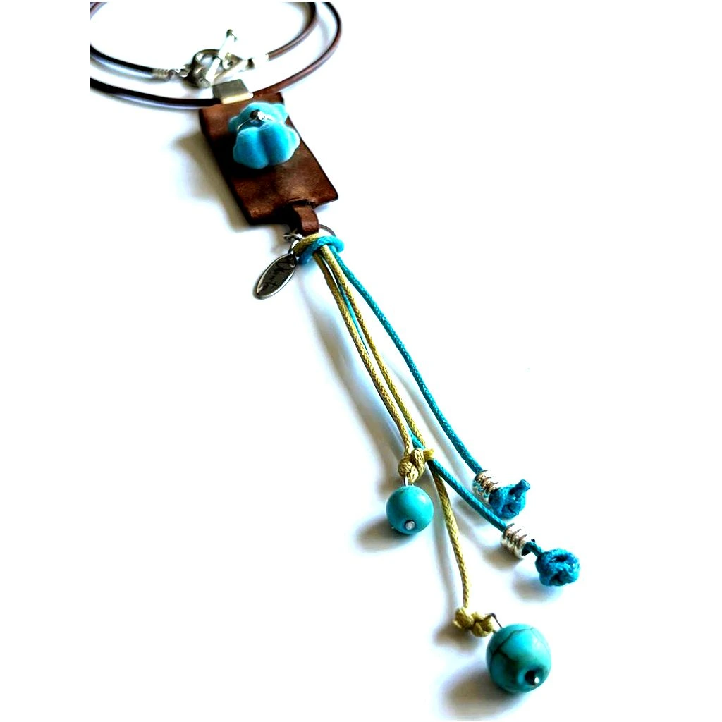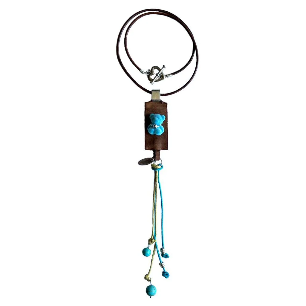 El dije principal integra piel natural con oso azul pastel en relieve, acompañado de acentos en tonos azul y beige que aportan contraste y personalidad. Los elementos colgantes estilizan la silueta y añaden movimiento, creando una pieza ligera pero con presencia.