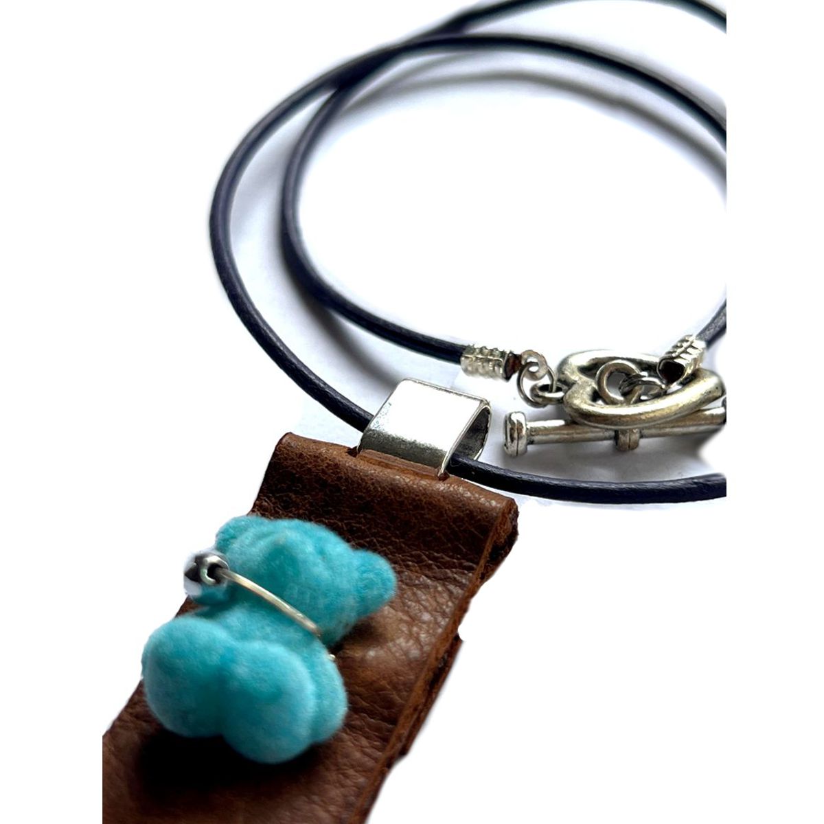 Medidas y Materiales: Banda de cuero: 40cm; Dije de piel con oso: 4cm; Largo total de dije con tiras de piel: 9 a 10cm. Materiales: Piel, cuero, componentes color plata, acero inoxidable, piedra natural, pewter.