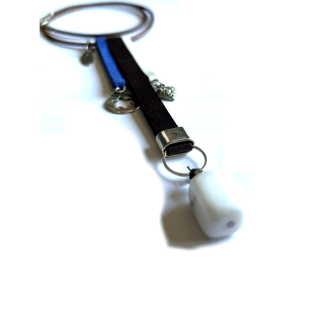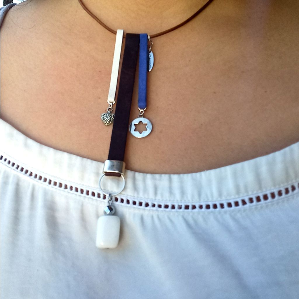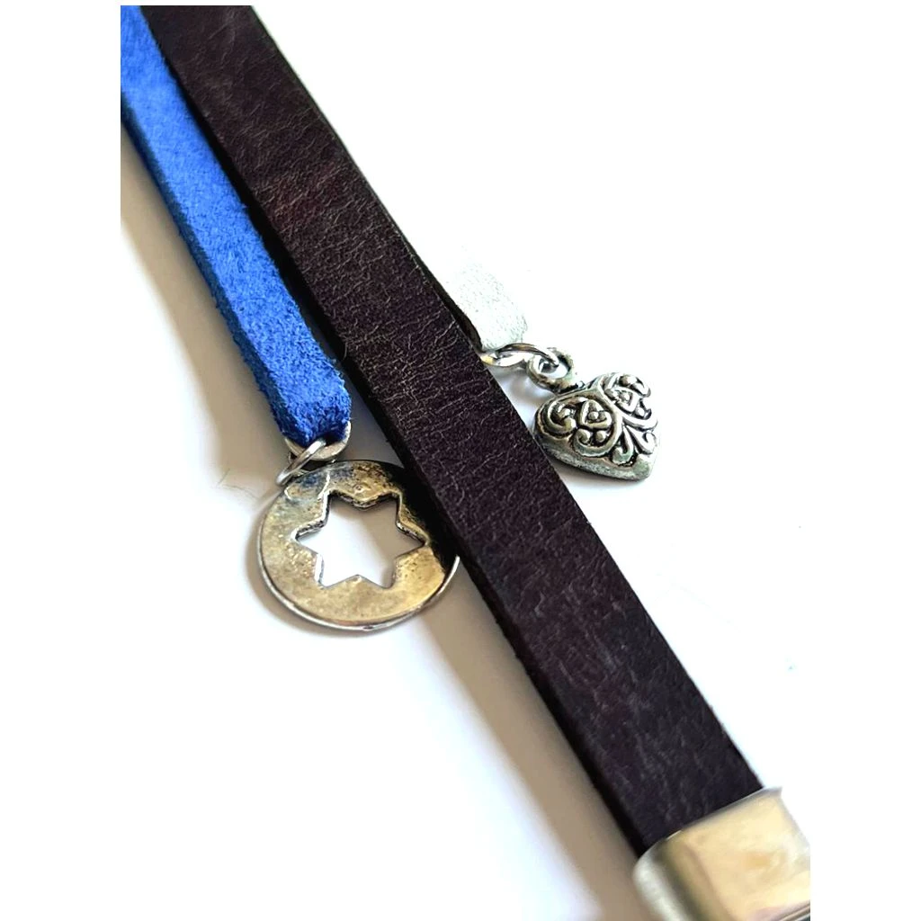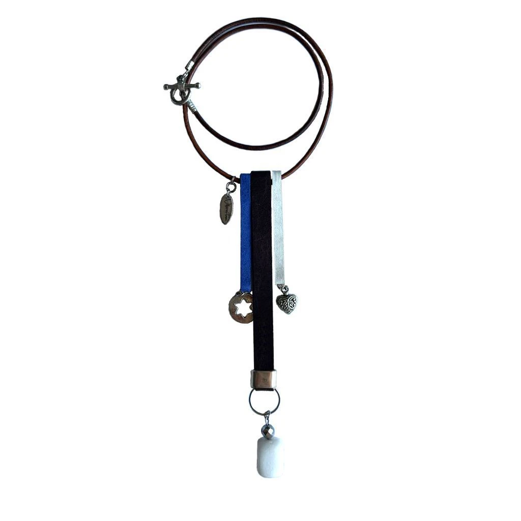 Medidas y Materiales: Banda de cuero: 40cm; Banda de piel con piedra: 13.5cm; Banda de piel con charm: 7 a 7.5cm. Materiales: Piel, cuero, componentes color plata, acero inoxidable, piedra natural, pewter.