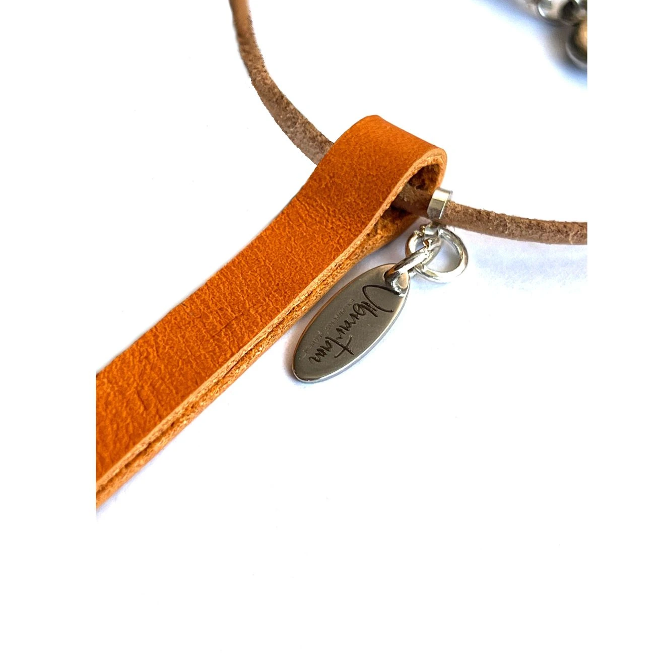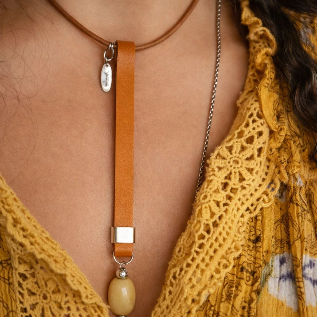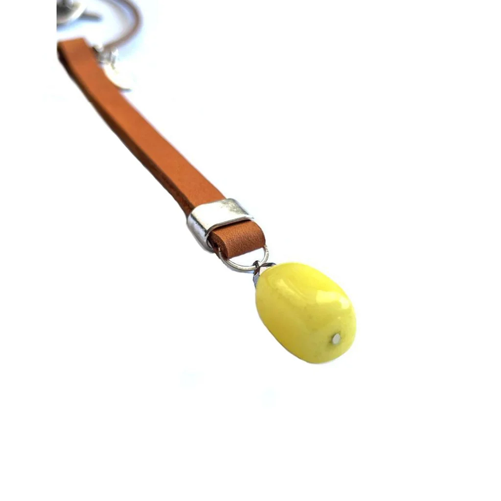 Medidas y Materiales: Banda de cuero color natural: 40cm; Banda de piel color amarillo con piedra: 13.5cm; Piedra jade pintado amarillo. Materiales: Piel, cuero, componentes color plata, acero inoxidable, piedra natural, pewter.