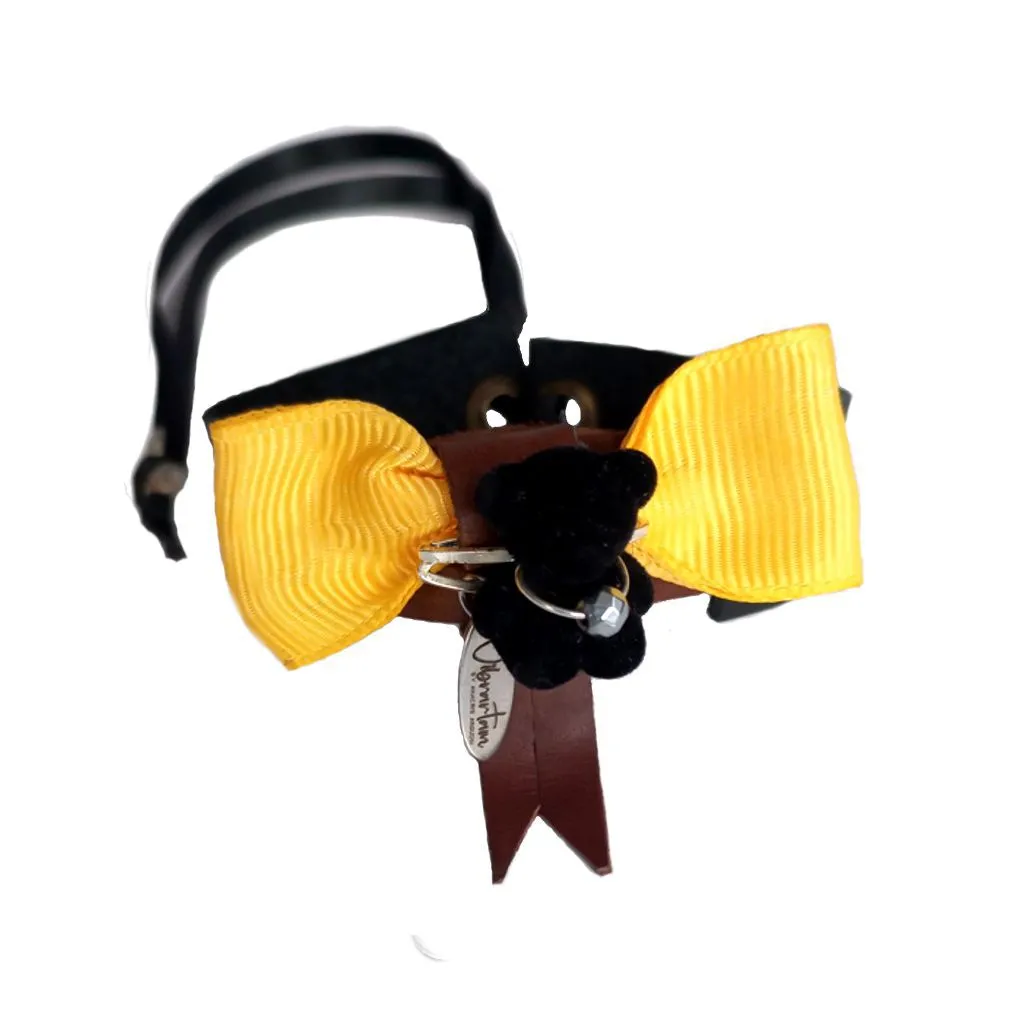El diseño integra piel color negra, moño de seda color amarillo con oso color negro en relieve. Elementos que aportan contraste y sofisticación a la pieza. Se ajusta en la parte posterior mediante un cierre tipo corset con listón para adaptar la medida de forma cómoda y segura.