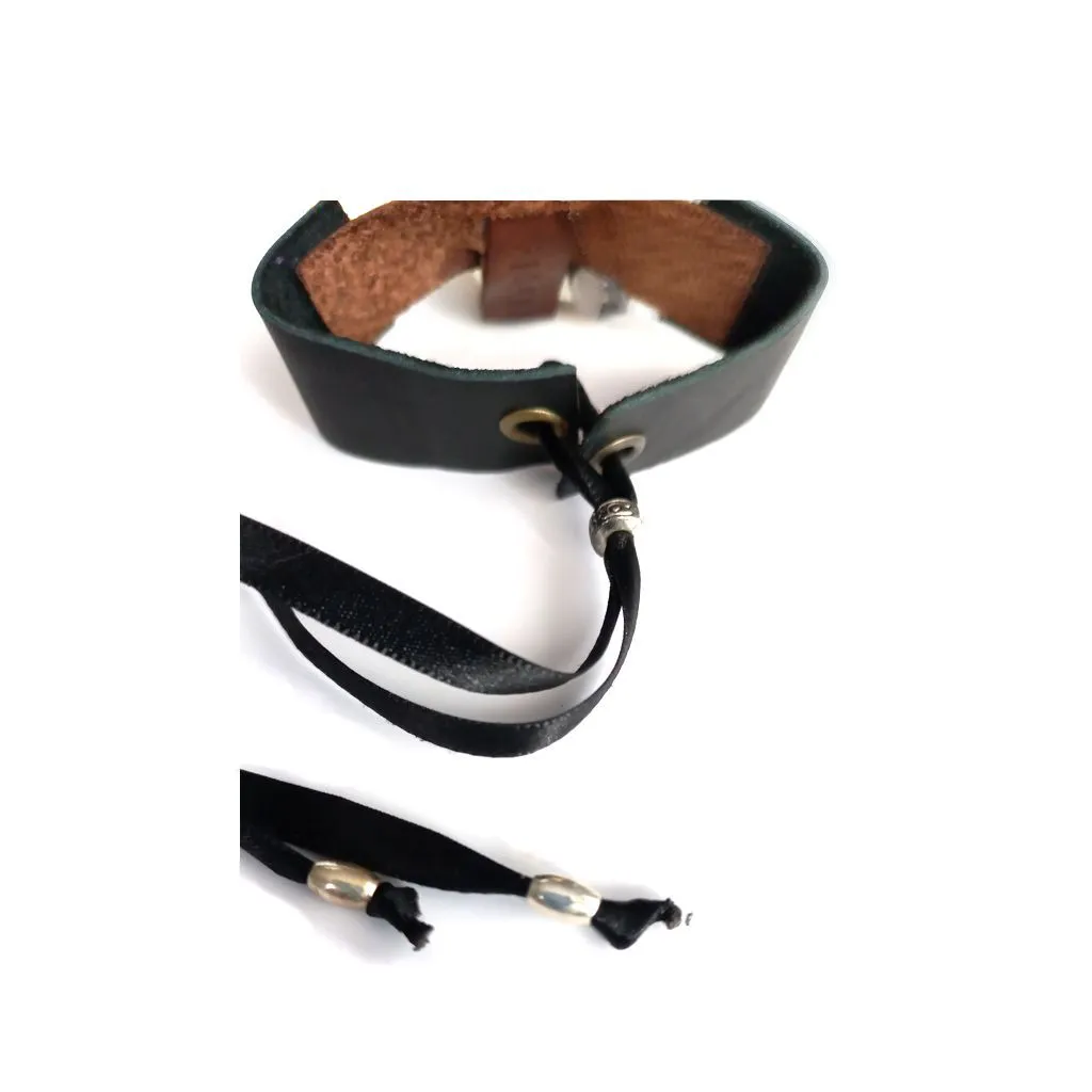 Medidas y Materiales: Ancho de pulsera: 2 cm;  Medida de moño: 5.5 cm con oso: 1.8cm;  Materiales: Piel, cuero, componentes color plata, acero inoxidable, piedra natural, pewter.